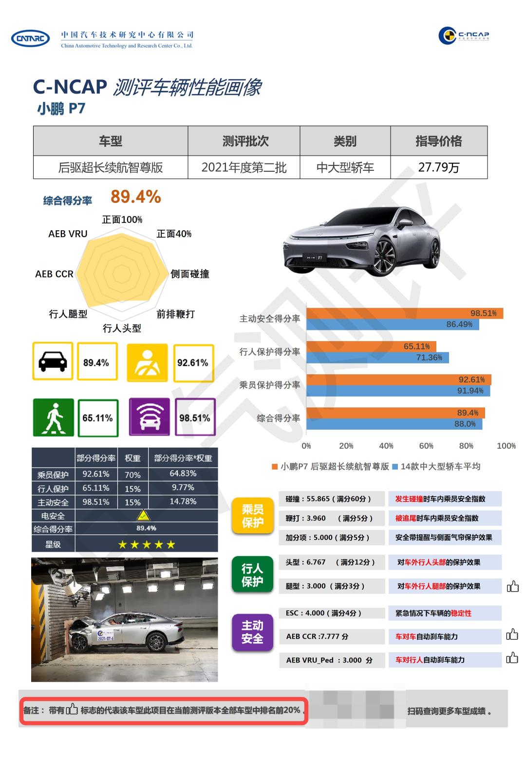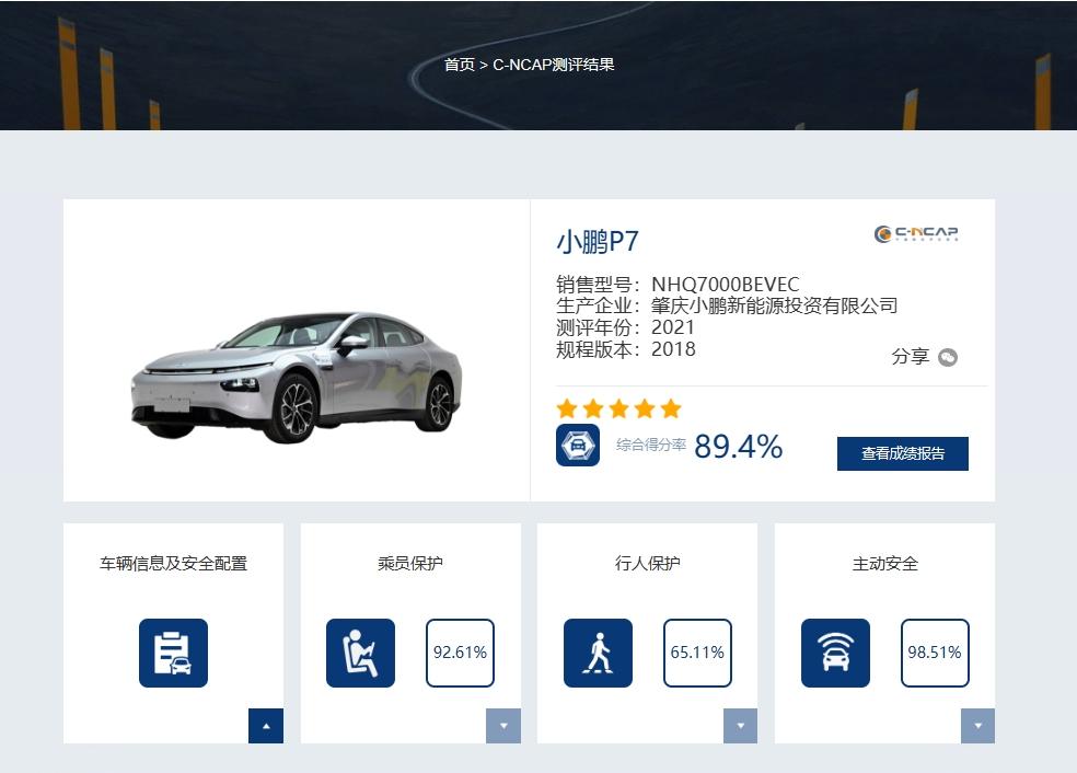 C-NCAP官网显示,小鹏P7与2021年进行了C-NCAP测试,测试结果为五星,综合得分率89.4%。