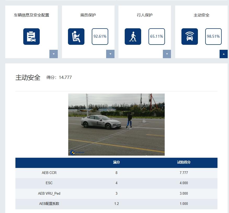 AEB在“主动安全”类目里。其中,AEB CCR(车辆追尾自动紧急制动系统)满分为8分,小鹏P7得分为7.777;AEB VRU_Ped(行人自动紧急制动系统)满分为3分,小鹏P7得了满分;AEB配置系数满分1.2分,小鹏P7得分1分。
