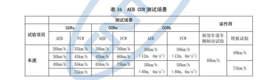AEB CCR的测试场景包括:不同时速的CCRs(前车静止)、CCRm(前车运动)、CCRb(前车制动)测试,以及误作用测试。