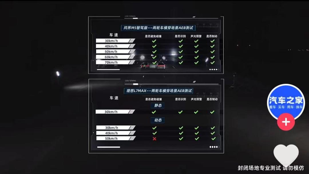 比如,8月29日,汽车之家发布了一条视频,对问界M5智驾版和理想L7 MAX进行了AEB测试。测试时间也是晚上,不过有路灯。