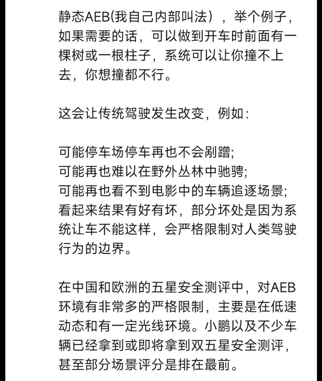 对此,何小鹏今日(8日)发长文回应表示,静态AEB会限制驾驶行为边界。“那么,为什么少数车型看上去更好呢,因为这是将智能辅助驾驶(司机在这个时候是被动)的能力,下放给人主动驾驶的状态。实际这是所有高阶自动辅助驾驶厂商的基本能力。”