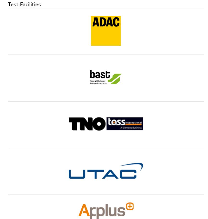至于测试所使用的设施,Euro NCAP官网只显示了一些公司的名字,并未显示具体道具。不过,大概率也是使用的假车和假人。如果用真的,极度危险且成本太高。