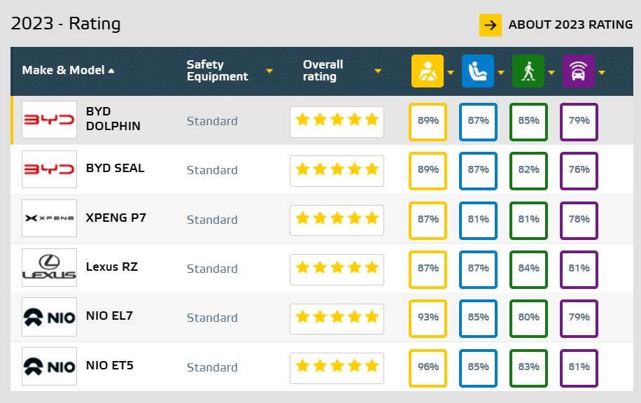 据Euro NCAP官网显示,其今年测试的7款车型分别为比亚迪海豚、比亚迪海豹、小鹏P7、雷克萨斯RZ、蔚来EL7和蔚来ET5。七款车型均是五星的成绩。