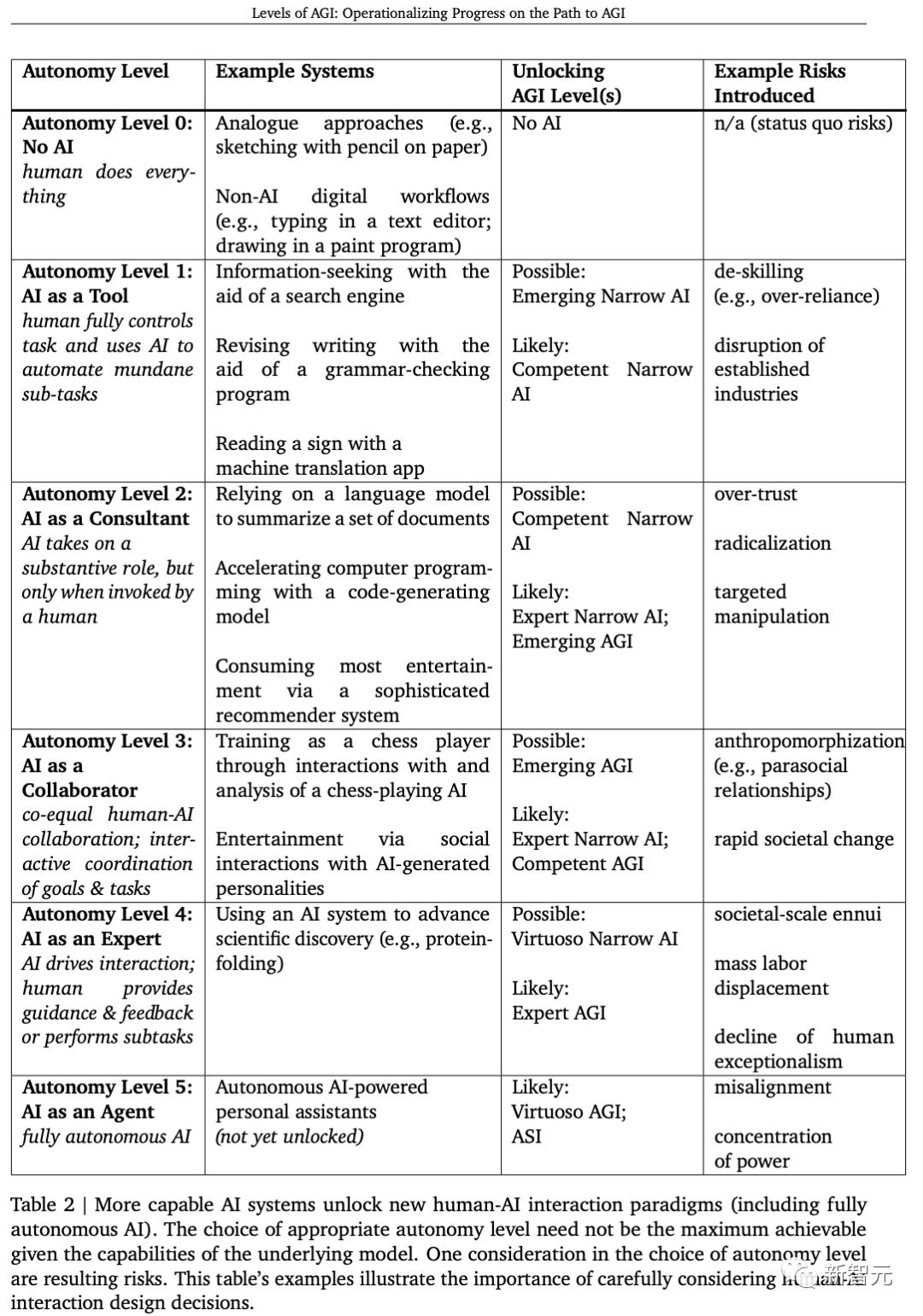 上表2说明了AGI级别、自主级别和风险之间的相互作用。