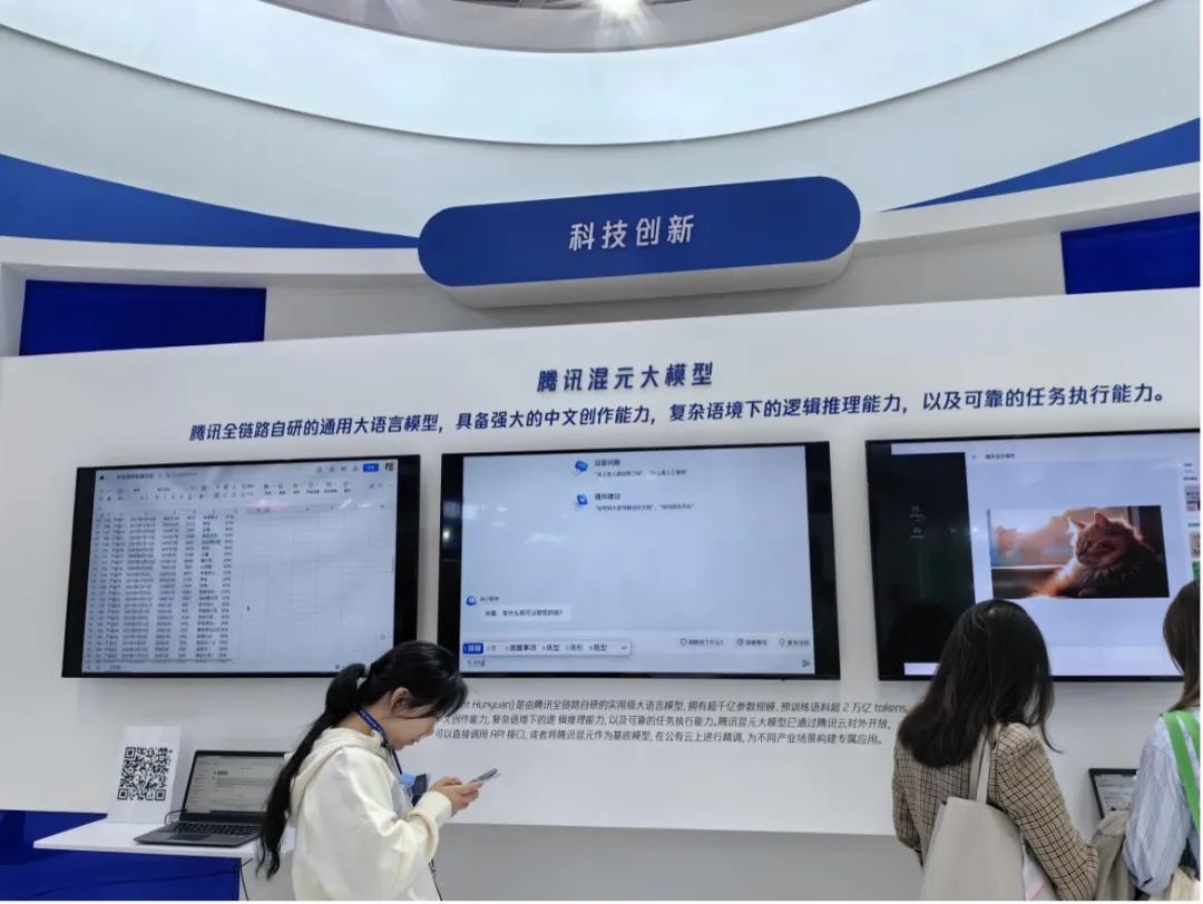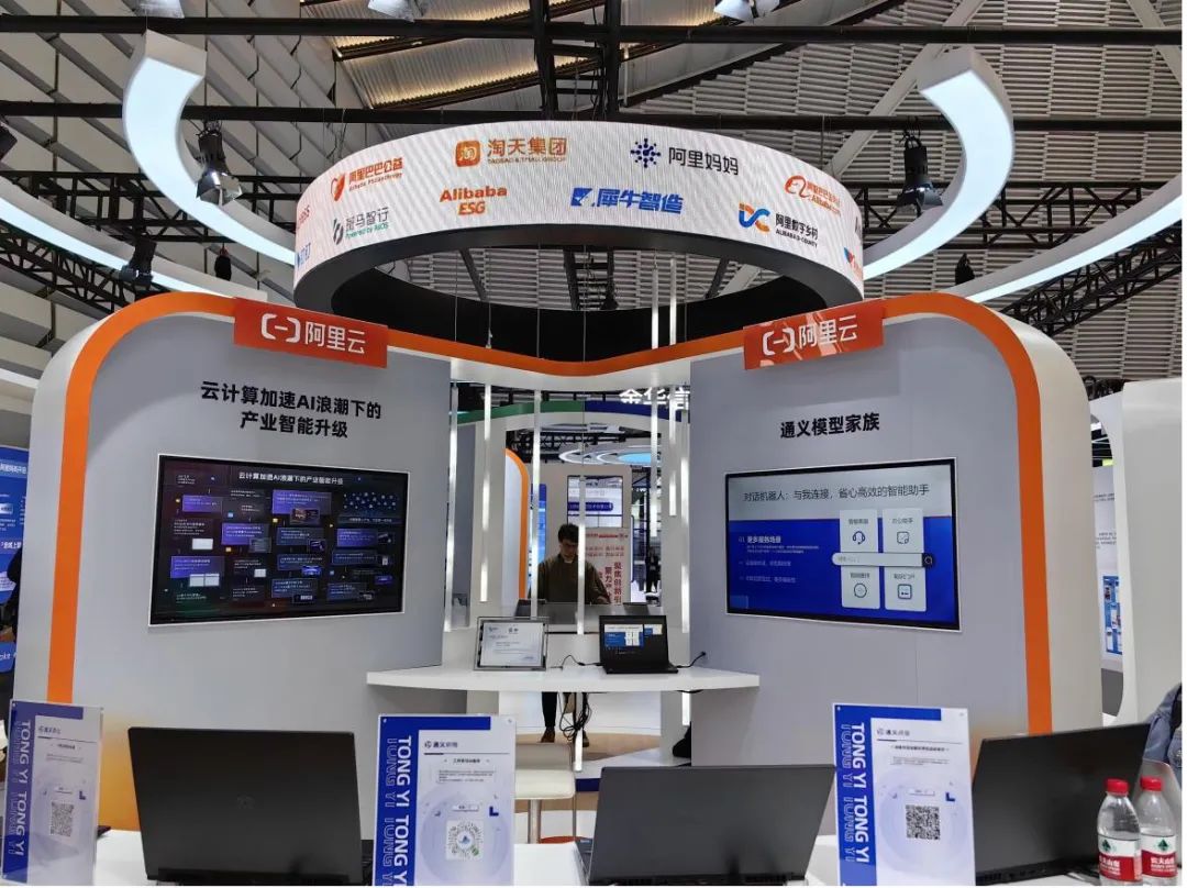展会现场,阿里巴巴通义千问、华为盘古大模型、腾讯混元大模型以及蚂蚁集团百灵大模型等代表性大模型,均被放在了最为显眼的位置,优先展示。
