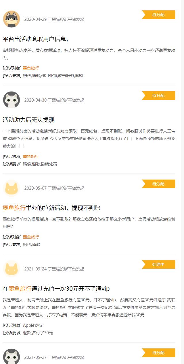 但在黑猫投诉上,近些年不乏关于墨鱼旅行会员模式乱象的投诉,有多名网友指称,“墨鱼旅行举办的拉新活动提现不到账”等问题。