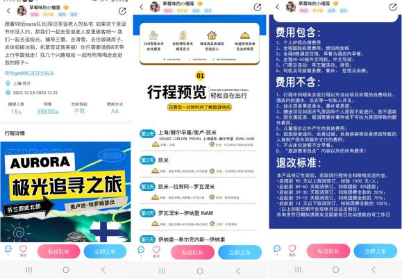以墨鱼旅行平台上@草莓味的小榴莲发布的“带你get网红式芬兰玩法”组团为例,该博主称“机票签证我来搞,你只需要请假8天带上行李跟我走”,该团期望人数16人,预算高达38800元/人,出行时长8晚,墨鱼旅行平台显示其中157人想去。