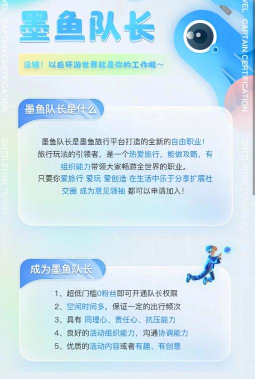 旅界实际下载墨鱼旅行App发现,成为该平台的墨鱼队长并不难,按照其官方口径“超低门槛0粉丝即可开通队长权限”,享受流量扶持、高额工资、高额奖金等诸多“官方扶持”与“超级福利”。
