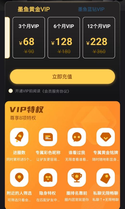 旅界查阅墨鱼旅行APP发现,购买墨鱼旅行黄金会员VIP可以获得“进圈数”、附近的人筛选、隐身特权、圈排名靠前等多项权益。