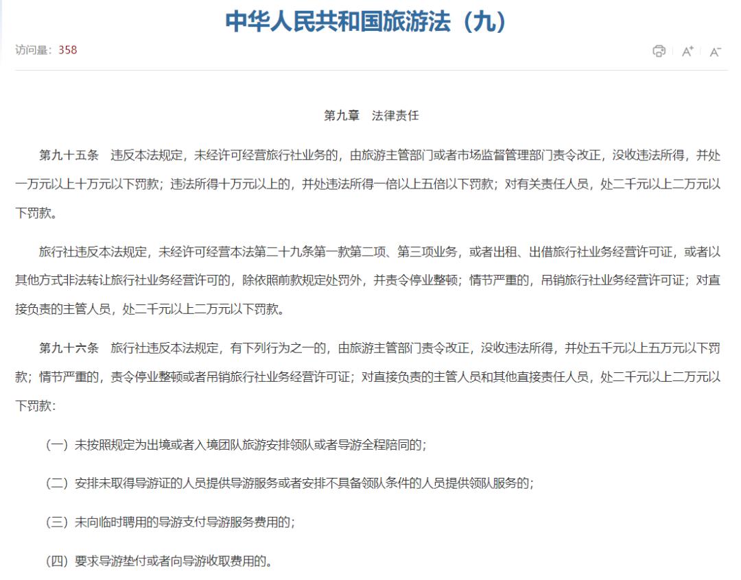 《中华人民共和国旅游法》第九十六条则同时规定安排未取得导游证的人员提供导游服务或者安排不具备领队条件的人员提供领队服务的情节严重的,责令停业整顿或者吊销旅行社业务经营许可证;对直接负责的主管人员和其他直接责任人员,处二千元以上二万元以下罚款。
