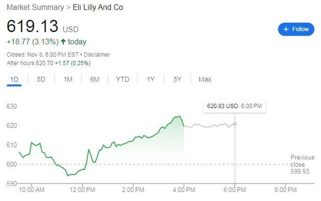 消息公布后,礼来股价涨幅持续扩大,尾盘接近626美元刷新日高时,日内涨超4%,最终收涨3.2%,收创历史新高。