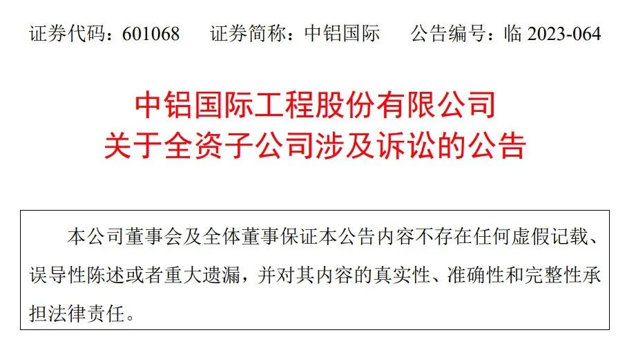 11月8日晚间,中铝国际公告披露,公司全资子公司中国有色金属工业第六冶金建设有限公司(以下简称“六冶”)起诉贵州宏财投资集团有限责任公司(以下简称“宏财投资”)等,讨要5648.23万元工程款等。