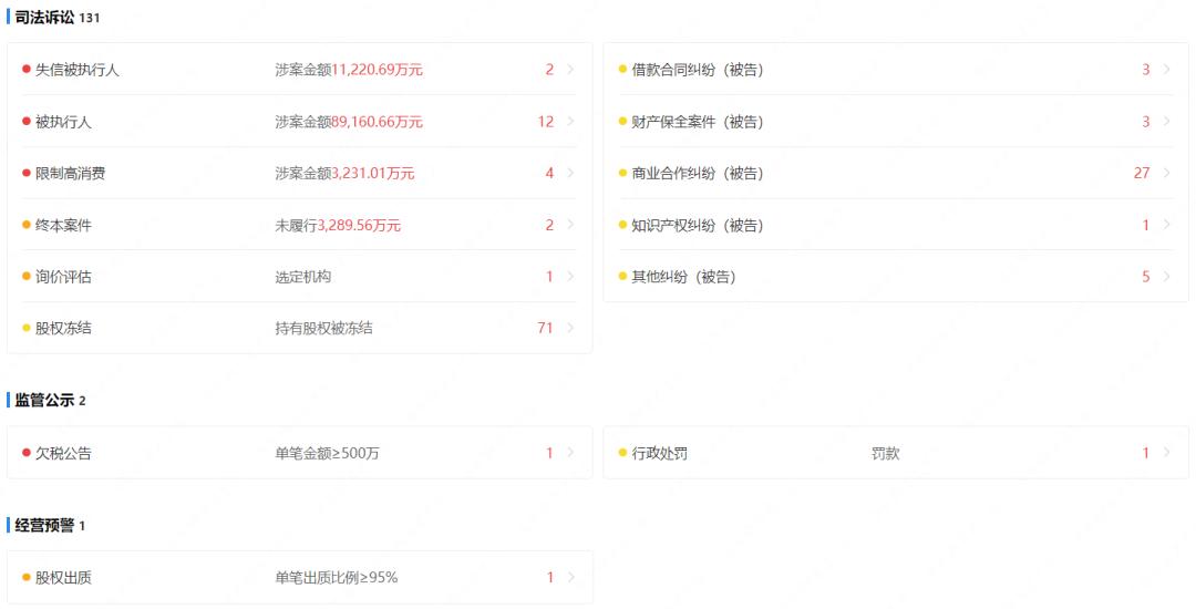 企查查数据显示,宏财投资名下司法涉诉信息高达131条,其中有失信被执行人2条,合计金额1.12亿元;被执行人12条,合计金额8.9亿元。此外还有限制高消费4条、股权冻结71条。另外还有一条单笔欠税大余500万元被行政处罚的记录。