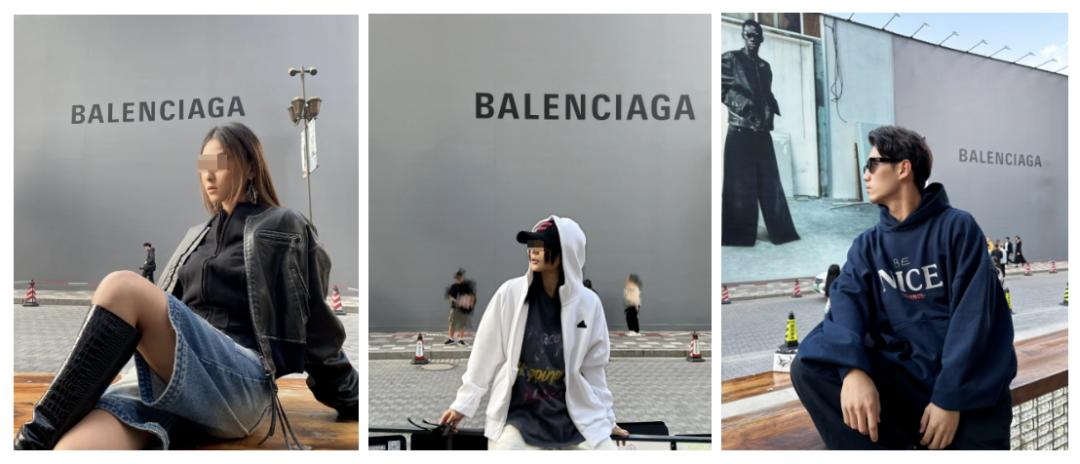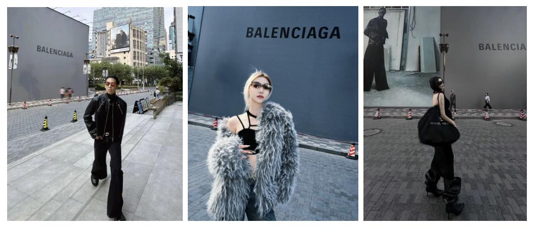 于是人行道是秀场,大马路是T台。到这儿打卡,考验的不止穿搭,还得看会不会凹造型、会不会找角度、会不会利用道具与品牌元素互动、有没有拍出巴黎世家式的【造型必须离谱且态度必须嘲弄】。