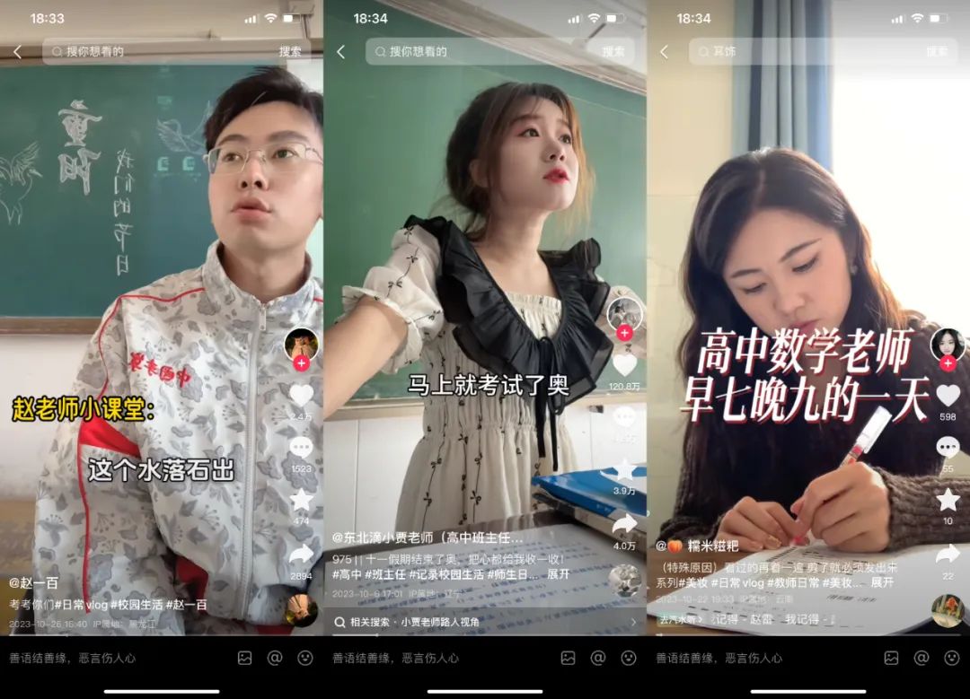 近年来,教育部等有关部门提出的各项宣传学习教育活动,如思政教育、护眼、安全教育等,均提及利用好短视频这一形式。通过视频实现从个人到教师群体形象的正确树立。但在庞大的流量平台面前,中小学教师开始尝试记录更多的“美好生活”,逐渐完成教师到博主的转变。上课“开火车”检查英文单词的英语老师「大河向东流」已经辞职开始带货直播;“扔炸弹”接力背诵语文课文的「东北滴小贾老师」开启小号接广告模式,停更大号,疑似辞职;「木子和又又」因学生入镜头等多重原因身陷舆论风波,已清空穿搭小号店商品……