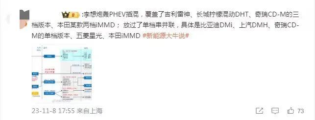 还有汽车博主总结,李想炮轰PHEV的技术路线是多挡插混,覆盖了 吉利雷神、长城柠檬混动DHT、奇瑞CD-M的三档版本、本田某款两档iMMD。