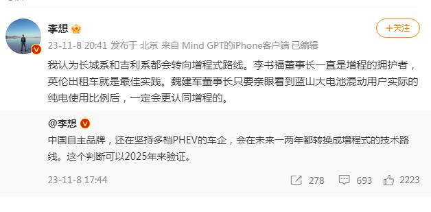 11月8日,李想毫无征兆地发了一条微博,称“中国自主品牌,还在坚持多档PHEV的车企,会在未来一两年都转换成增程式的技术路线,这个判断可以2025年来验证。”