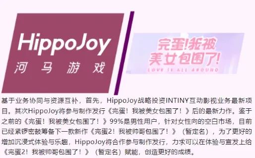紫天科技旗下的河马游戏(HippoJoy)更是官宣和《完蛋!》开发商intiny达成了战略合作,还将共同筹备《完蛋!》续作。鉴于首部作品99%是男性用户,下一款新作将会针对女性向的市场空白, 暂定名为《完蛋2!我被帅哥包围了!》。