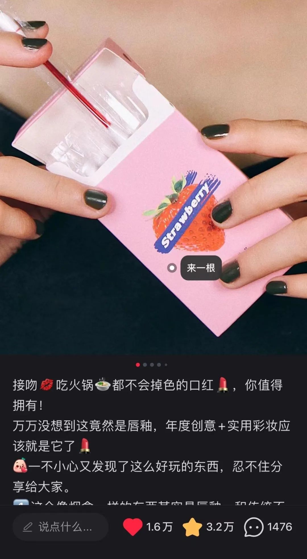 靠差异化定位和产品创意,第一款产品烟盒唇釉没花钱就成为了小红书爆款;
