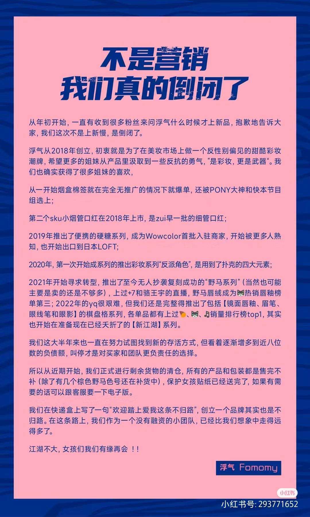在一则不足一千字的公告里,创始人 Double 为成立了近七年的「浮气Fomomy」画上了句点。创立于 2018 年的浮气Fomomy ,经历了新消费浪潮里一个新锐品牌所能体验的全部故事。