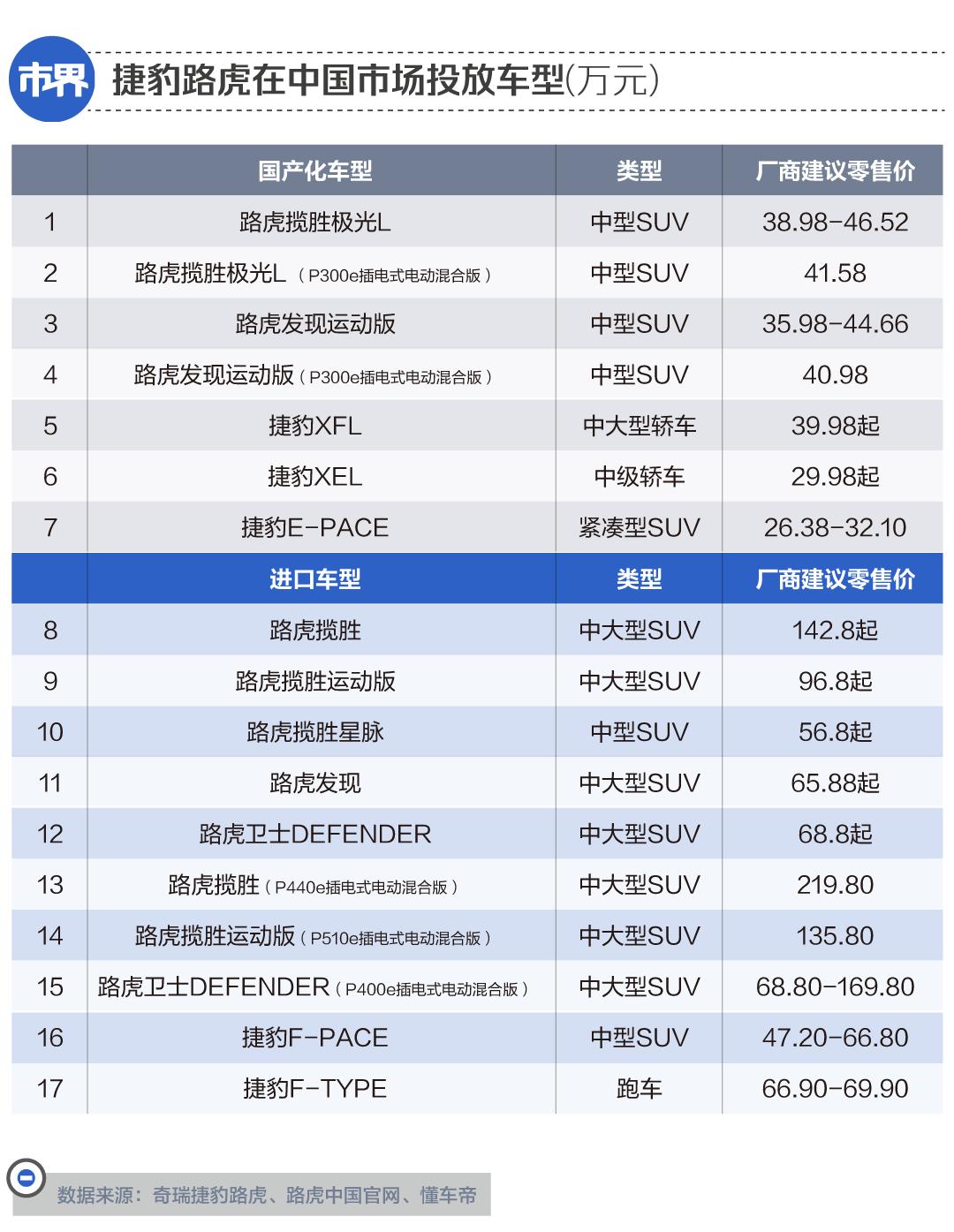 目前,捷豹路虎在中国市场总共投放了17款细分车型(区分燃油车与新能源车),其中捷豹品牌有5款,路虎品牌有12款。在这些车型中,有7款进行了国产化,由奇瑞捷豹路虎这家合资公司负责生产。