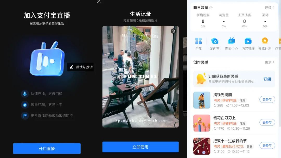 2021年底,支付宝首次为内容板块打开了一个一级入口,将2016年推出的“生活号”入口提拉到了首页。在彼时,仅有商户、企业、机构等B端主体可以发布内容,生活栏目更像是商家们的“朋友圈”。