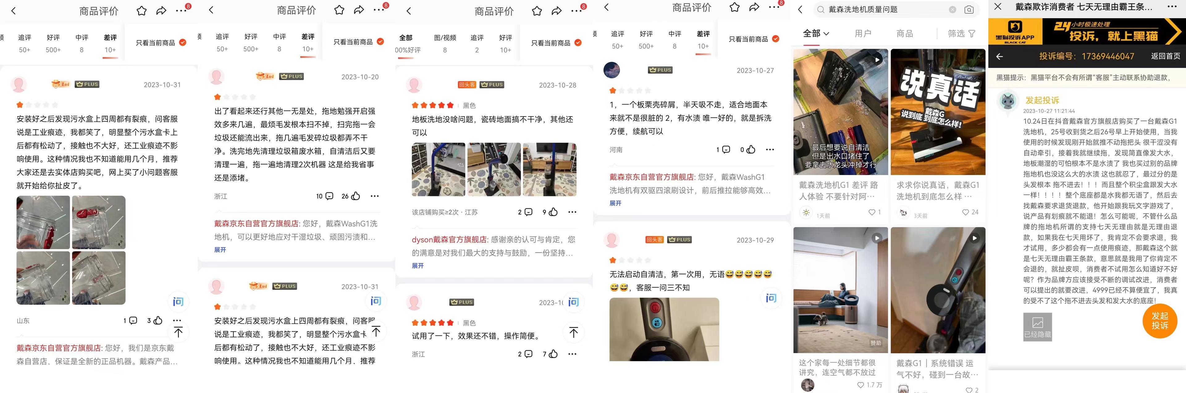 此外,「摩登消费」注意到,在京东、小红书、黑猫投诉等平台上,有不少关于戴森洗地机产品问题的控诉,涉及问题比如瓷砖地面搞不干净,污水盒四周有裂痕,板栗壳碎屑吸不走以及头发拖不进去等。