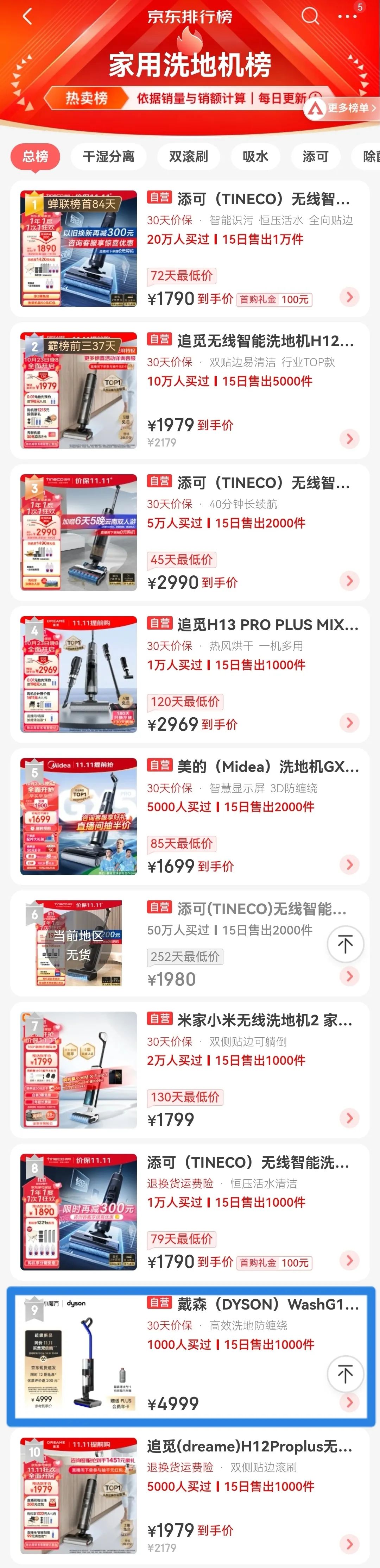 虽较晚入局洗地机领域,但戴森不甘示弱,据「摩登消费」观察,仅用半个月时间,WashG1洗地机便跻身京东家用洗地机总榜第9名。
