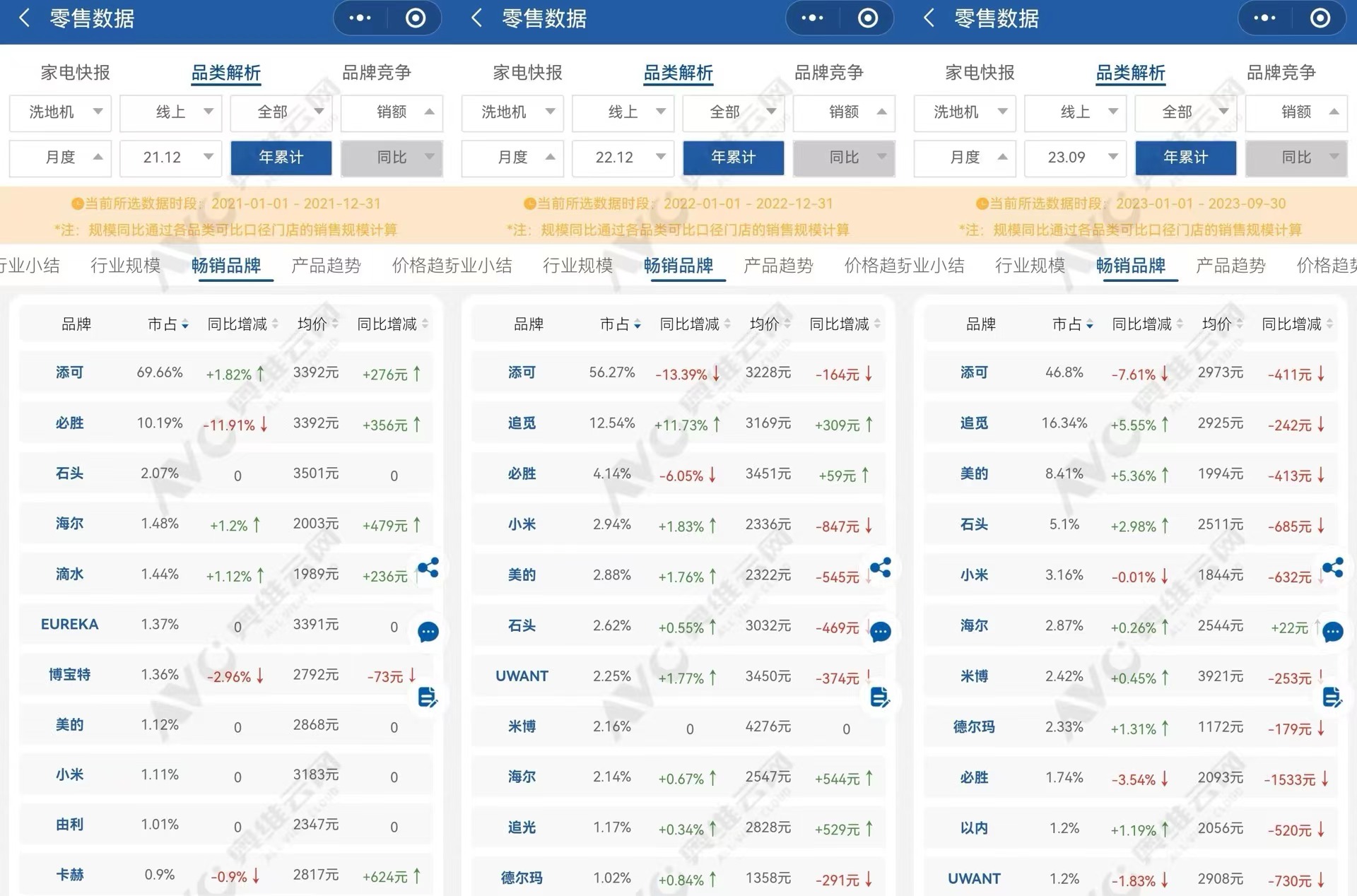 从国内线下销额来看,2021年-2023年前9个月,添可洗地机的市占率分别为61.49%、59%和60.19%,一直位列第一。