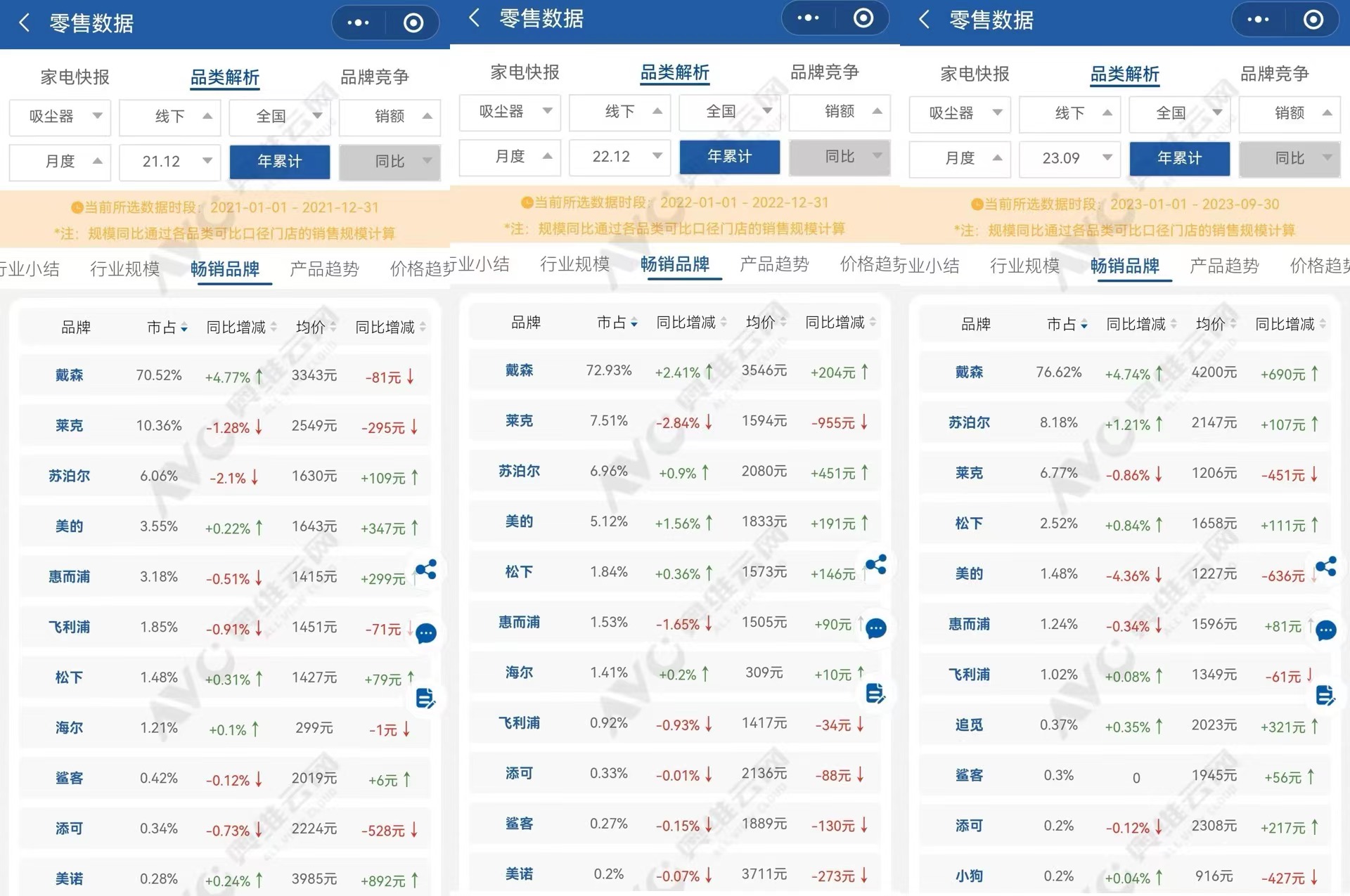 再看线下销售情况,2021年-2023年前9个月,戴森吸尘器在中国吸尘器市场的销额市占率分别为70.52%、72.93%和76.62%,始终位列第一。