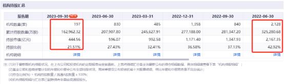 机构对隆基的持股,从2022年2千多家,总持股42.92%(占流通股比例),迅速锐减到今年Q3只剩197家,持股比例也腰斩到了21.51%。(Q2还有830家/27.43%)。