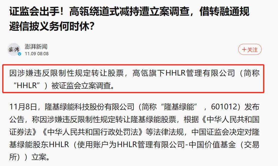 11月8 日晚间,隆基绿能公告称,公司股东HHLR公司收到告知,因涉嫌违反限制性规定转让隆基绿能股票,证监会决定对HHLR (HHLR管理有限公司-中国价值基金) 公司立案调查,而HHLR是高瓴资本下属公司。
