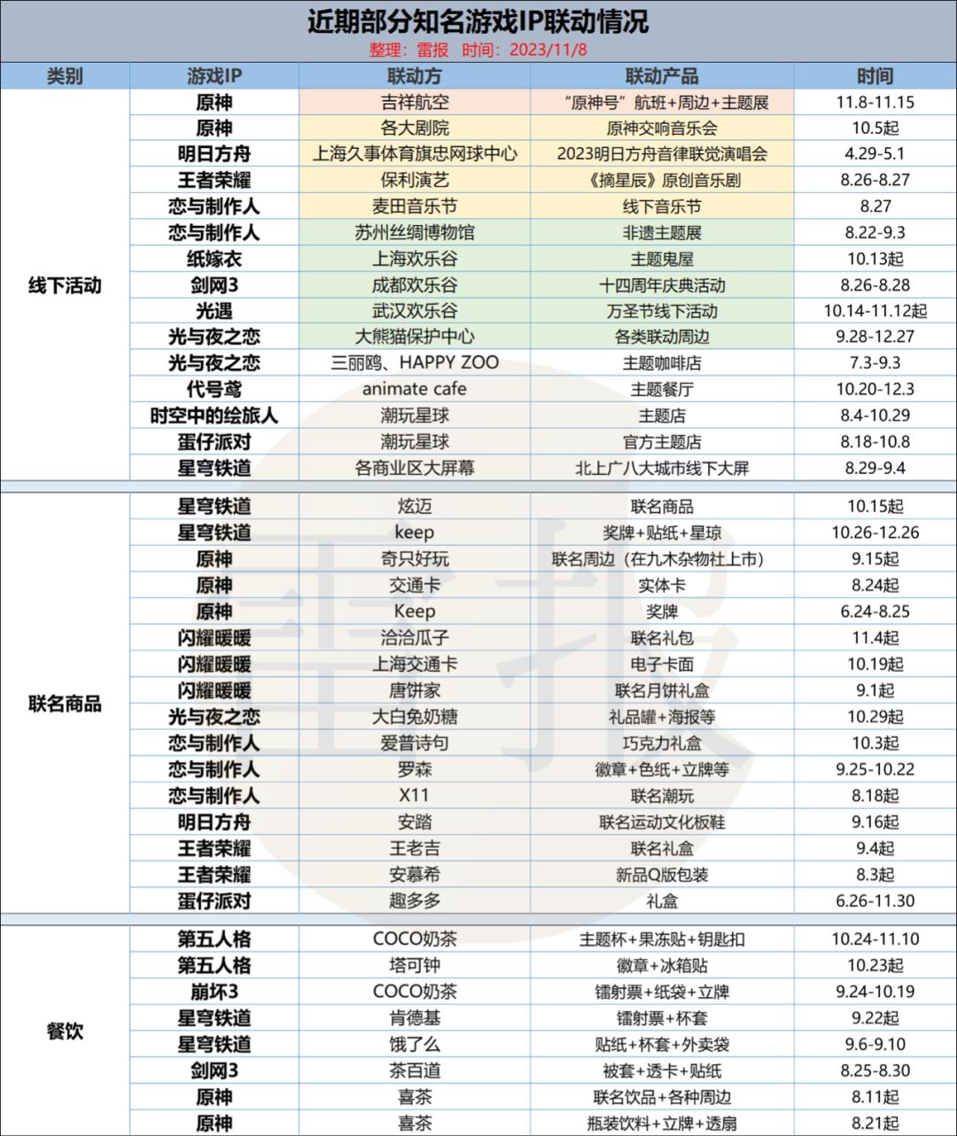雷报【微信:leinewspaper +关注】对近期部分知名游戏IP的联动情况进行了整理。大致可以分为三大类:餐饮联动、联名商品以及线下活动。