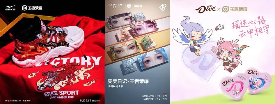 王者荣耀和鸿星尔克、完美日记、德芙的联动商品