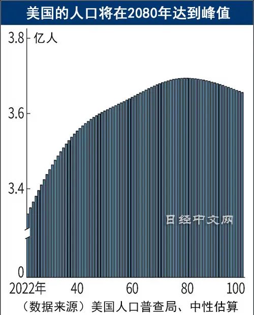 美国人口普查局根据2020年的人口普查等数据做出了预测。以最有可能实现这一前提进行估算的中性估算显示,从2023年(3.35亿人)到2080年将持续增加。之后将呈现减少趋势,到2100年减少到3.66亿人。