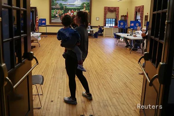 一名选民带着孩子来到美国纽约一个投票点投票(11月7日,Reuters)