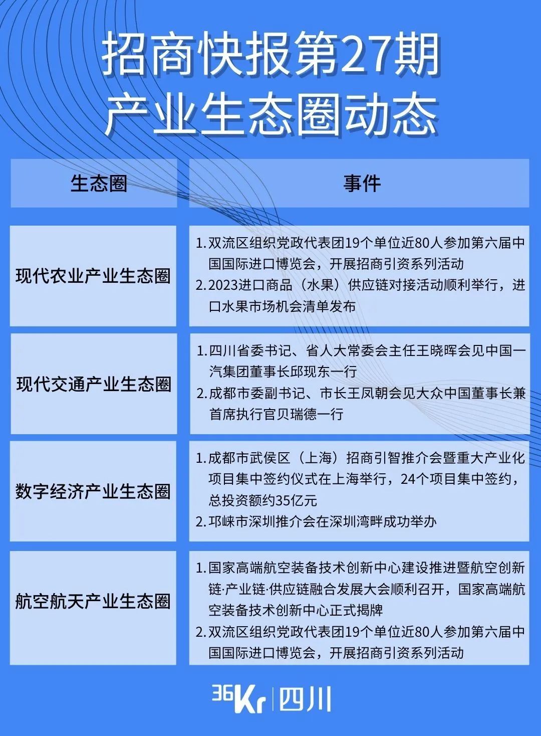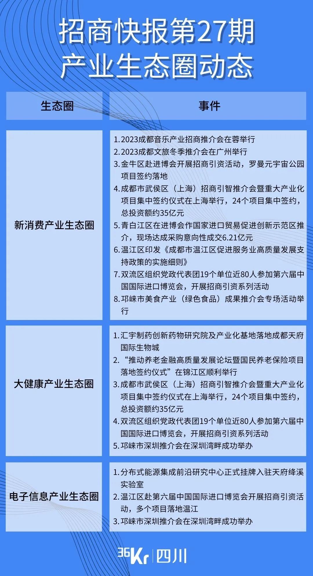2023年11月9日,36氪四川通过公开渠道,共收录11月2日—11月9日成都市23个区(市)县相关的招商资讯、政策信息37条。