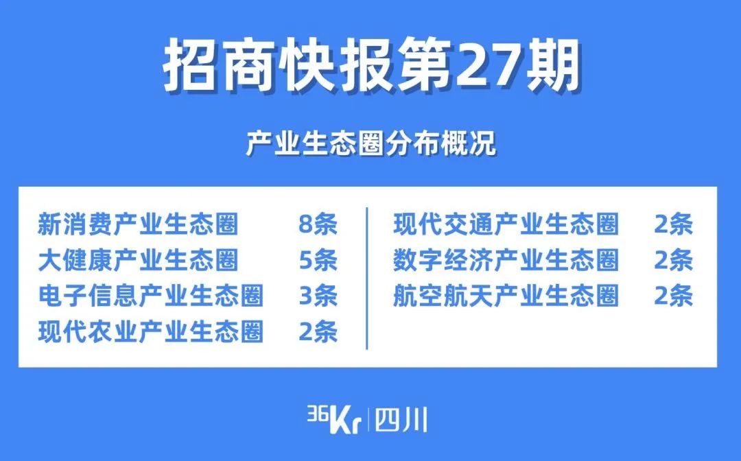 通过对产业生态圈内容的汇总,过去一周的招商动态主要集中在新消费产业生态圈(8条)、大健康产业生态圈(5条)、电子信息产业生态圈(3条)、现代农业产业生态圈(2条)、现代交通产业生态圈(2条)、数字经济产业生态圈(2条)、航空航天产业生态圈(2条)。