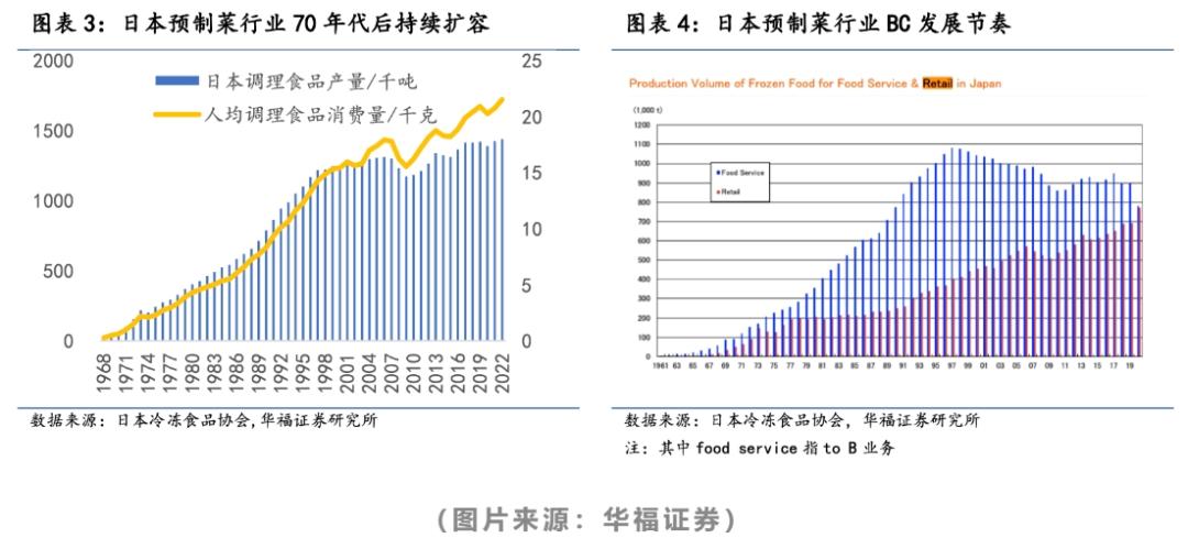 从日本预制菜行业BC发展节奏中可以看到,1997年之前,日本预制菜行业的to B业务一路攀升,在1997年之后却一路下滑,近年来才略有回升,主要原因在于1997年亚洲金融危机之后,日本人均可支配收入降低,失业率大增,国民外食频次与单价双降,餐饮行业承压连带的to B业务冷冻食品销量下降。与此同时,to C业务则穿越了经济低迷期,几乎是稳步攀升,背后原因是社会人口结构和消费时代的变化。随着小型家庭(少于等于2人)占比持续提升、人口老龄化加剧、女性就业率不断上升,普通民众对方便快捷、高性价比的饮食需求不断提升;这些因素使得日本预制菜行业to C业务得以持续扩张。