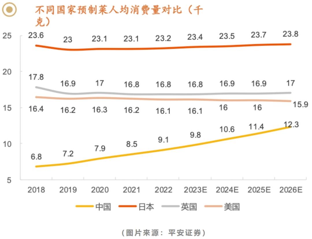 预制菜起源于欧美,在上个世纪60年代由日本发扬光大,经过多年的发展,日本的人均预制菜消费量早已远超过英美和中国。根据艾媒咨询,2022年,我国人均预制菜消费量9.1kg,日本人均预制菜消费量23.2kg,约为中国的2.5倍。