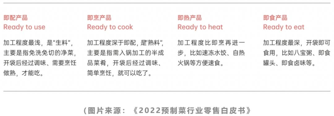 虽然预制菜还没有国标,但行业内也有普遍认可的定义,一般将预制菜定义为「以农、畜、禽、水产品为原料,配以各种辅料,经预加工(如分切、搅拌、腌制、滚揉、成型、调味)或预烹饪(如炒、炸、烤、蒸、煮等)制成,并进行预包装的成品或半成品菜肴,经简单烹饪或加热后,可作为日常正餐食用」。根据加工深度和方便程度,行业内通常把预制菜分为即配、即烹、即热、即食四类。