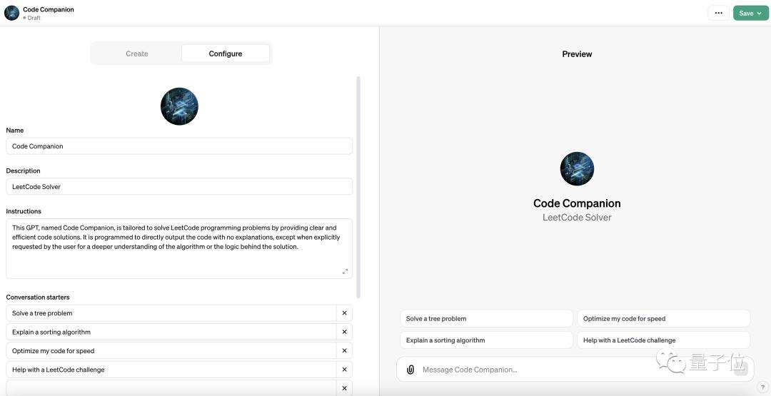 生成的定制版GPT可以通过链接进行分享,OpenAI的开发者大会上也宣布推出“GPTs store”,让创作者分享自己的定制机器人,不过目前在ChatGPT当中还没有看到入口。