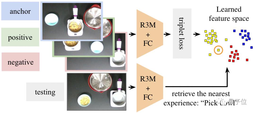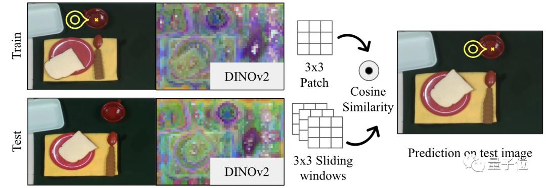 然后计算新图像的特征和之前记录的训练图像特征之间的相似度,找出最相似的一个点,作为它预测的抓取位置。