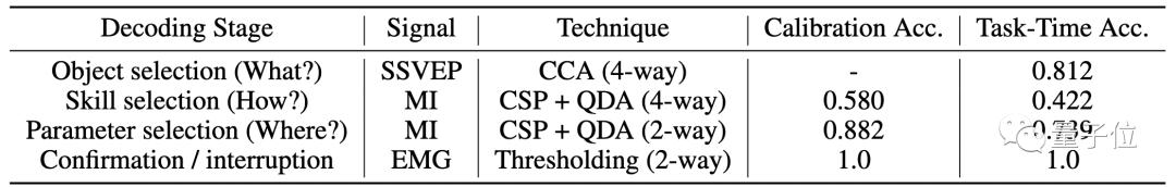实验各阶段的解码准确率和其它脑机接口研究差不多,但使用这种方法可以将对象和技能选择时间降低60%,从45.7秒缩减到18.1秒。