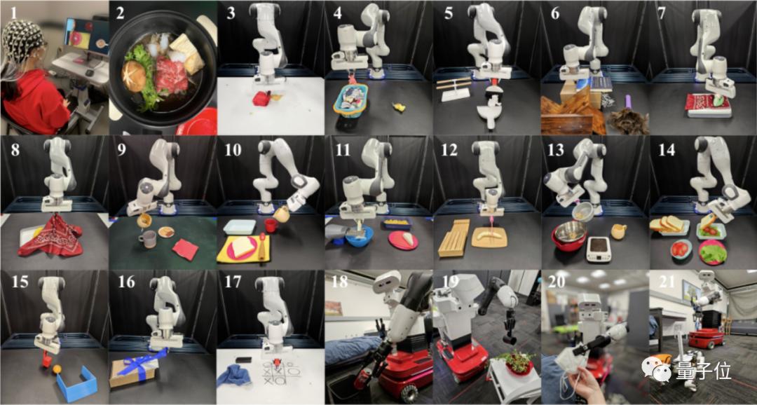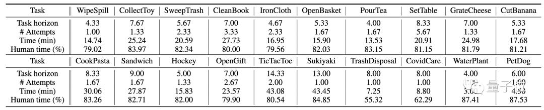 使用NOIR系统,3名人类参与者完成了上面我们所介绍的20项日常活动任务,其中包括16个桌面操作任务和4个移动操作任务。