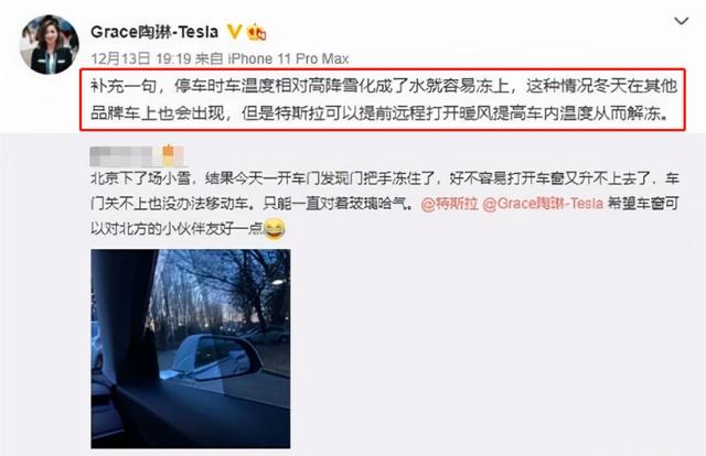 2020年,有网友发微博称,自己的特斯拉汽车因下雪导致车门把手无法正常打开,车窗玻璃也无法正常升起,并@了时任特斯拉对外事务副总裁的陶琳。而陶琳也给出了解决办法:提前远程打开空调暖风以让车辆解冻。