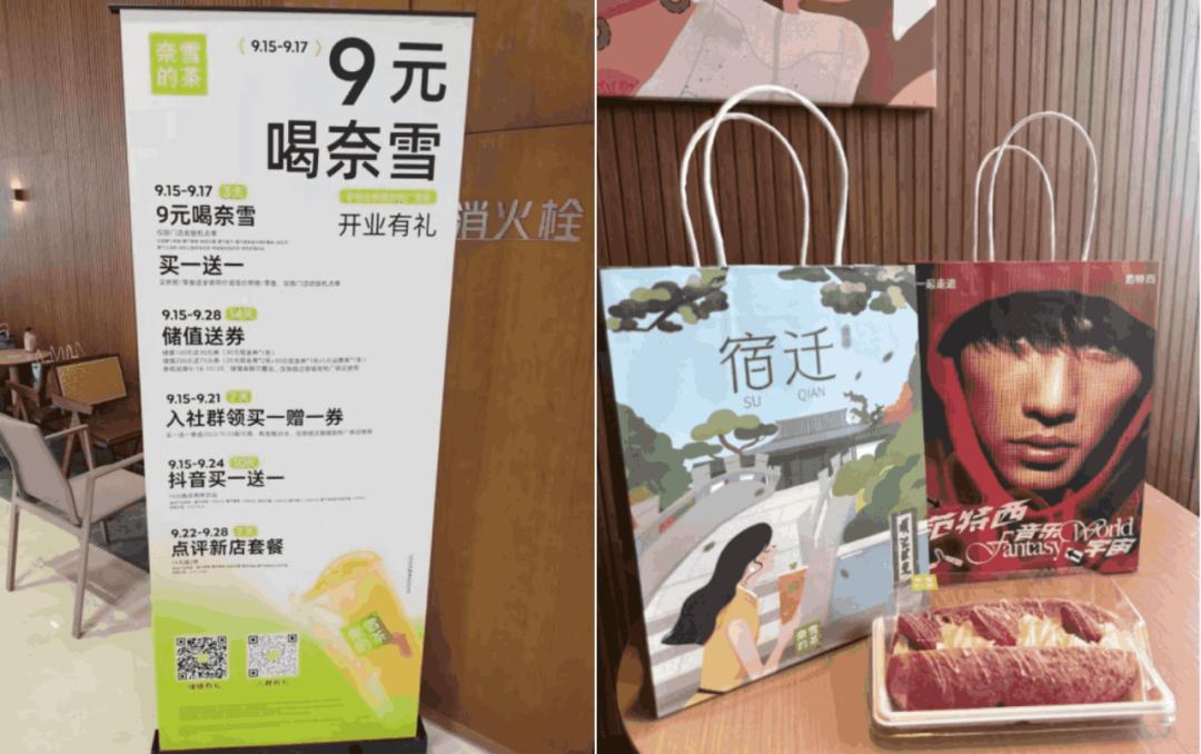 江苏宿迁泗阳吾悦店还有个“拍围挡送500杯奈雪”的活动。门店开业前拍摄围挡照片,加上门店定位,带话题发布于任意社交平台,保留至开业即可到店免费领1杯中杯茉莉初雪奶茶或金牡丹,限量500杯。扬州仪征宝能环球汇店针对大众点评推出“打卡有礼”活动,LV3及以上用户任意消费且收藏打卡,即可获赠限量周边袋子。