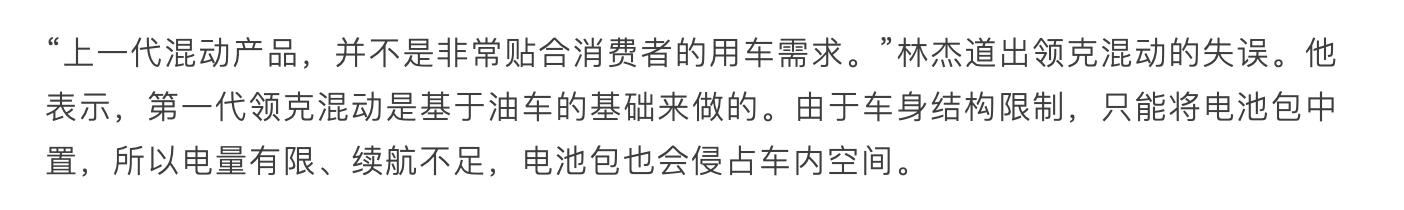 在新能源这块,领克似乎也还差口气,虽然它也推出过不少混动产品。但第一代领克混动车属于典型的”油改电“,最明显的问题就是续航不足。连领克自己也承认——“上一代混动产品,并不是非常贴合消费者用车需求”。