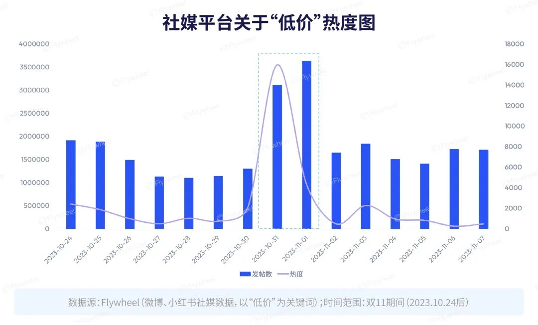 我们分析了微博、小红书为主的社媒平台数据,关于“低价”的热度从双11开始便居高不下,其中热度峰值出现在各大平台进入双11正式开售阶段的10月31日。