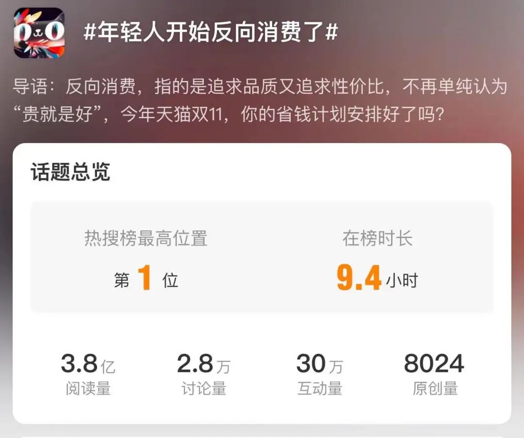 双11刚开场,“反向消费”就冲上了热搜,3.8亿的阅读量正在说明,人们的消费决策已经走向了价格驱动。这种对极度性价比的追求,逐渐形成了共同的消费心智。
